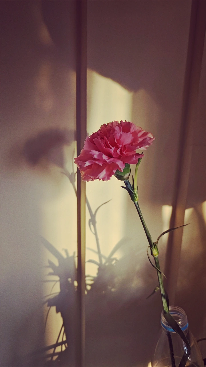 当阳光照进屋内,让瓶中的花印在了墙上