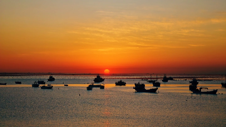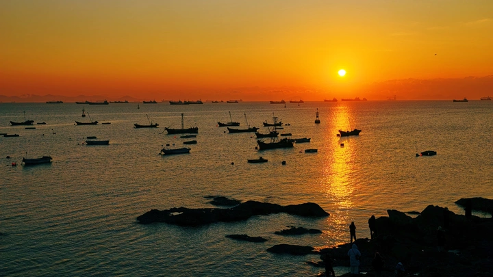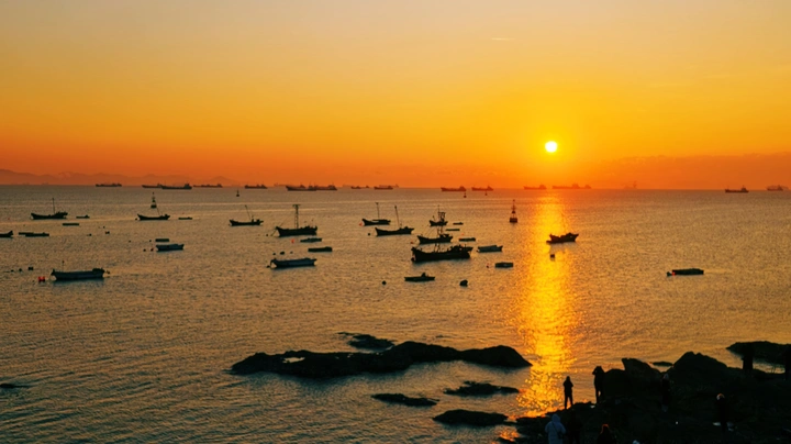 这是在旅顺柏岚子渔村用手机拍摄的日出。 点评: 这张海边日出摄影作品在色彩、构图、意境上都极具亮点,具体可从这几个维度点评: 1. 色彩层次:画面以橙红到金黄的暖色调渐变为主,日出的赤红与海面的蓝调形成强烈冷暖对比,光影在水面铺展出鎏金般的质感,色彩饱和度与过渡自然,营造出浓郁的氛围感。 2. 构图巧思:采用水平式构图,海平面将画面分割为天空与海面两大板块,视觉平衡且舒展;渔船以剪影形式错落分布在海面,既打破了画面的单调,又成为视觉锚点,让宏大的日出场景多了生活的烟火气。 3. 意境营造:日出与的渔船结合辽阔的海面,勾勒出“渔舟唱晚”的诗意画面,既有自然景观的壮美,又蕴含着渔港日暮的静谧与温柔,情绪表达细腻且有感染力。 @米拍 @米拍小助手 @米拍社长 @米拍编少