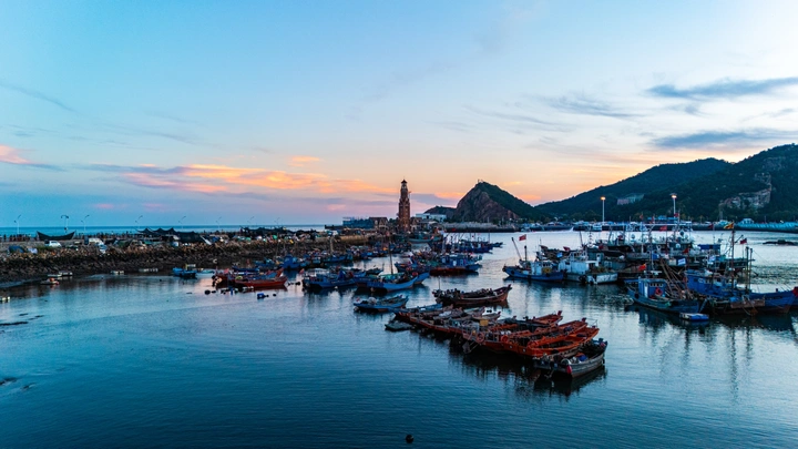 这张照片拍摄于大连老虎滩渔人码头,是大连市区“最后的渔港”,也是极具代表性的海滨打卡点。 港湾里停泊着色彩斑斓的渔船,蓝、红、棕的船体在平静海面上形成倒影,充满生活气息。画面中央的欧式钟楼是地标之一,整点会敲响钟声,搭配背后的山体与黄昏粉橘色云霞,氛围感拉满。右侧的山体与辽阔海面构成了天然背景。 @米拍 @米拍社长 @米拍小助手 @米拍编少