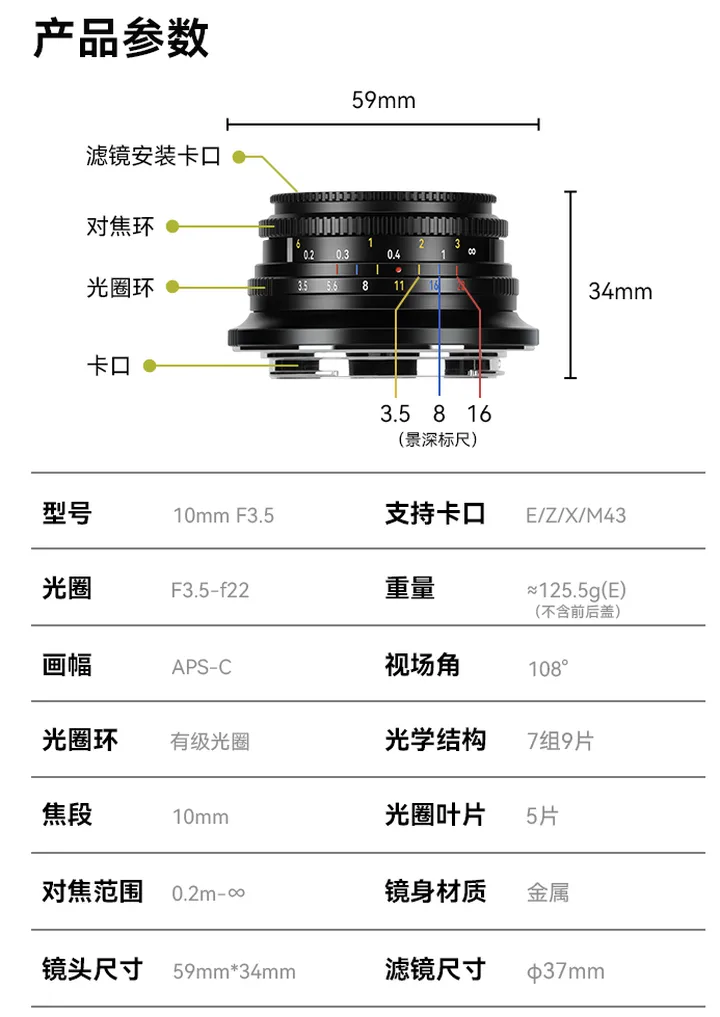 七工匠发布面向 APS-C 无反相机的全新超广角镜头 10mm f/3.5,兼容 Sony E、Fujifilm X 等多种卡口。其等效约 15mm 超广角视野,视角 108°,9 组 7 片光学结构,无鱼眼畸变。仅重 125.5 克,长 34mm,金属镜身,复古设计,光圈环可调 f/3.5 到 f/22,5 片光圈叶片,收小光圈可形成 10 道星芒,最近对焦距离 20 厘米。适合风光、建筑等摄影,全手动对焦,现已上市,售价 499 元。
