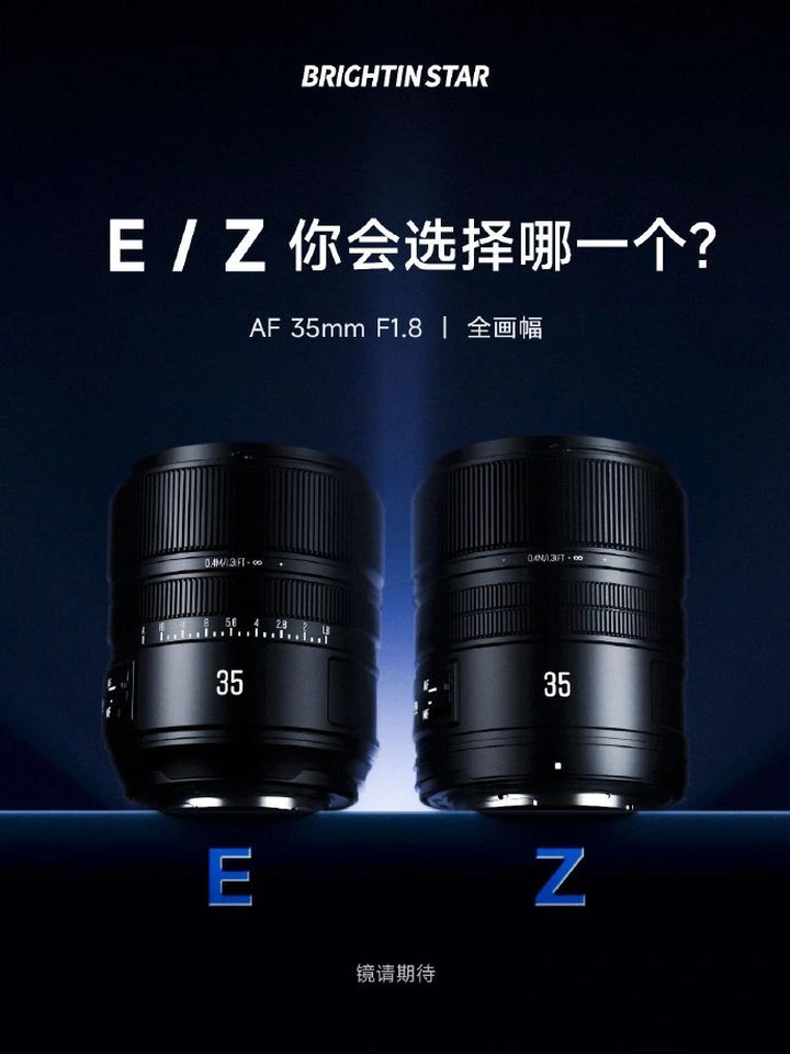 【镜请期待,星耀AF35/1.8即将到来】 国产新头厂商星曜光学发布新品预告海报,全画幅AF35mmF1.8即将到来,海报上还有一句话“E/Z你会选哪个?”,看来首批产品会优先推出索尼E卡口和尼康Z卡口。两家用户又有新选择了。