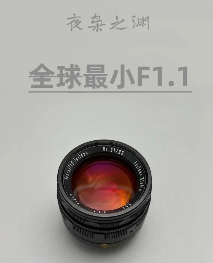 已发布的Lailens 50mm f/1.1为徕卡M卡口,全画幅像场,最大光圈F1.1,光圈范围F1.1-16,采用13片无级光圈叶片,支持黄斑联动对焦,最近对焦距离0.7m,重386g,长4.3cm,滤镜尺寸52mm。