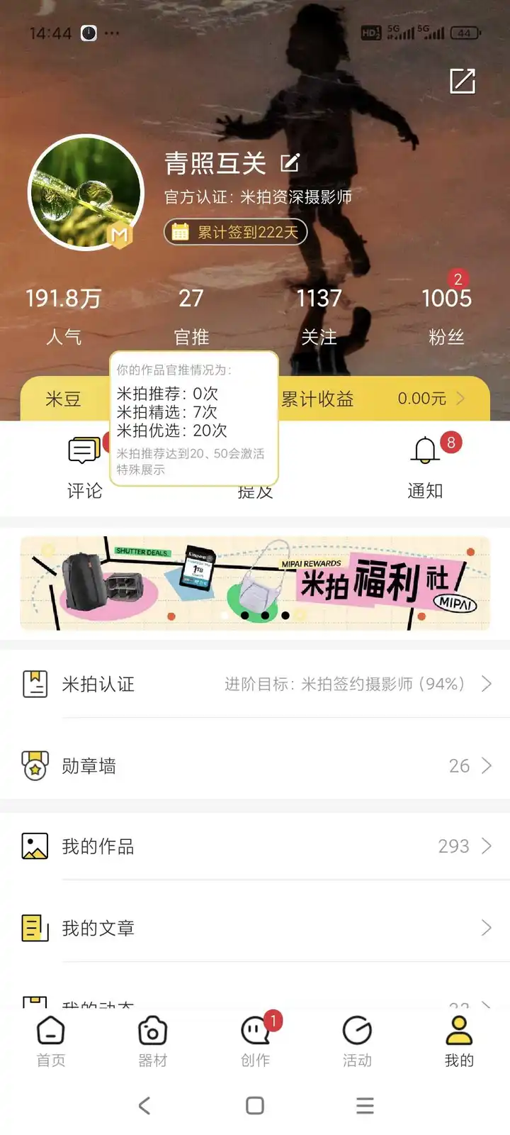 升级了,展示庆祝一下🎉 入住米拍一年半,近300组作品记录,27个官推,1000个粉丝真不容易啊,感谢支持关注我的摄友们❤️❤️,共同成长💪