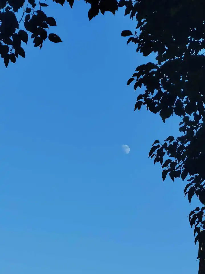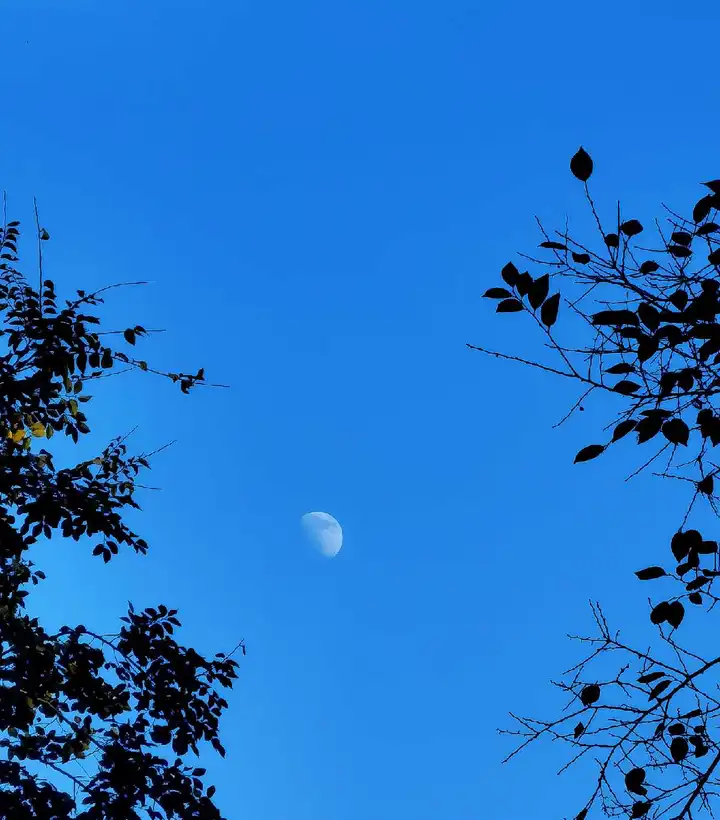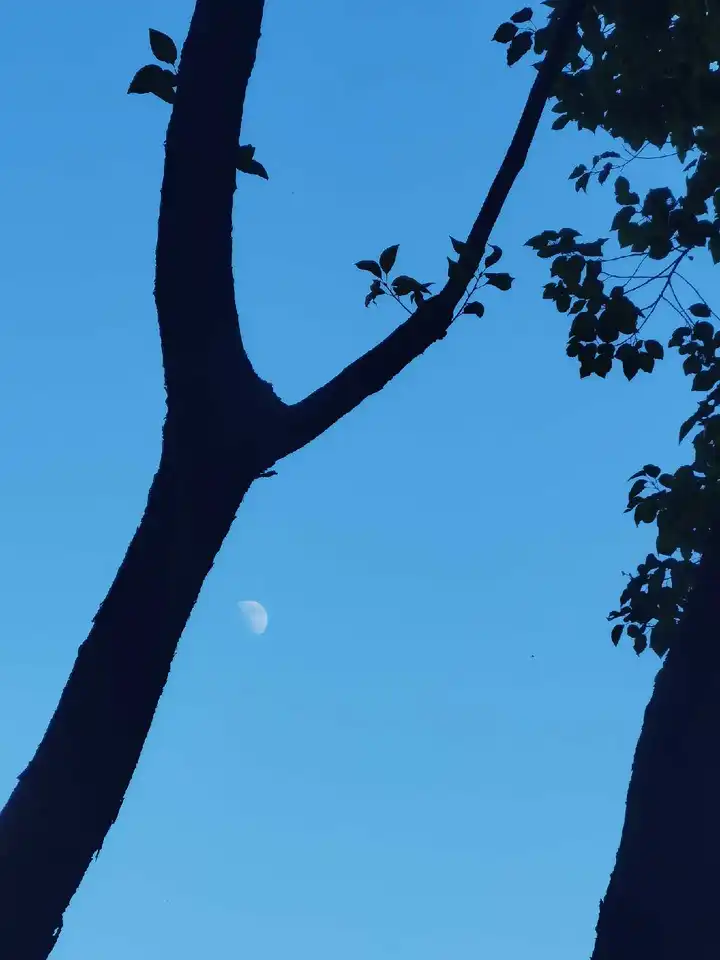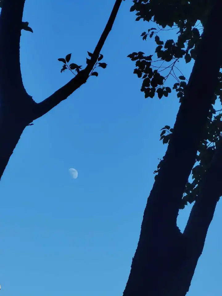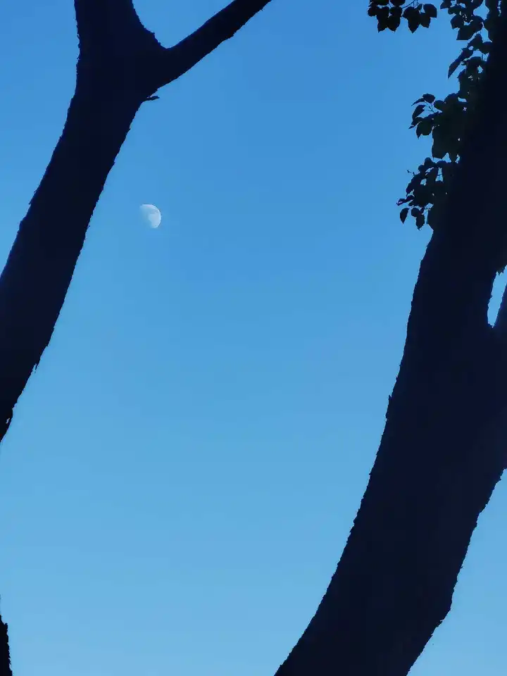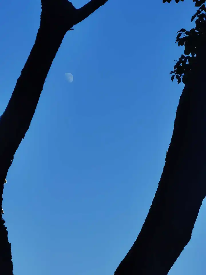 今天下午3点钟出门取快递,发现月亮。 今天十月十一,希望交换一张你家乡的月上树梢 。