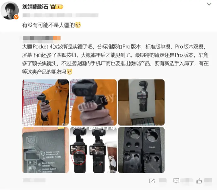 这一猜测得到了影石Insta360 CEO刘靖康的间接印证。他在个人社交媒体上转发了相关图片,并配文表示“可能不是大疆的产品”,这或许是对新款影石Pocket相机的暗示。