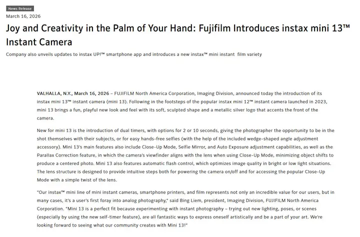 【富士海外发布Instax Mini 13, 仅售94美元!】