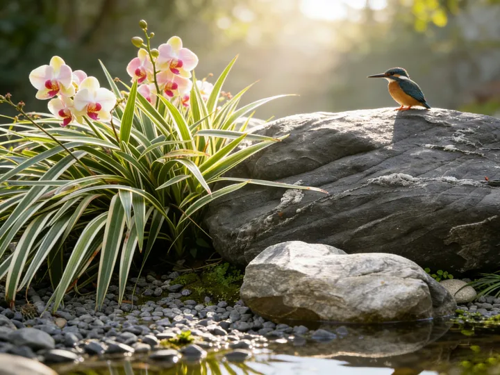 上帝之光穿过云层,温柔地铺陈在浸着水的黑石与白石上,水面漾着细碎的金光。兰草被晕染得鲜绿透亮,在光影里舒展着带金边的叶片。一只翠鸟静立石上,羽色如宝石般明艳,与这宋式禅意的小景相映成趣,仿佛下一秒就要衔着水光,飞入秋日的诗行里。