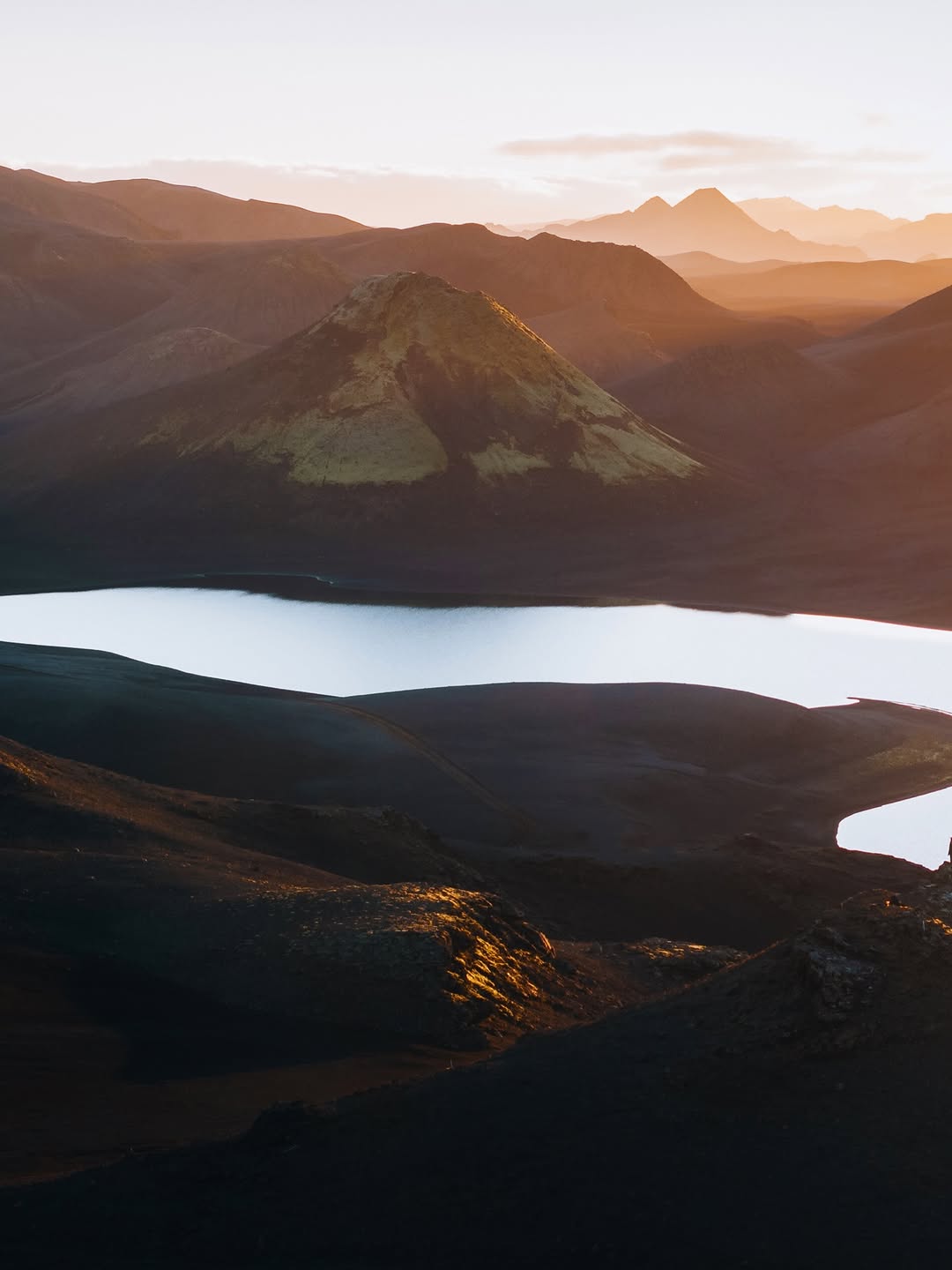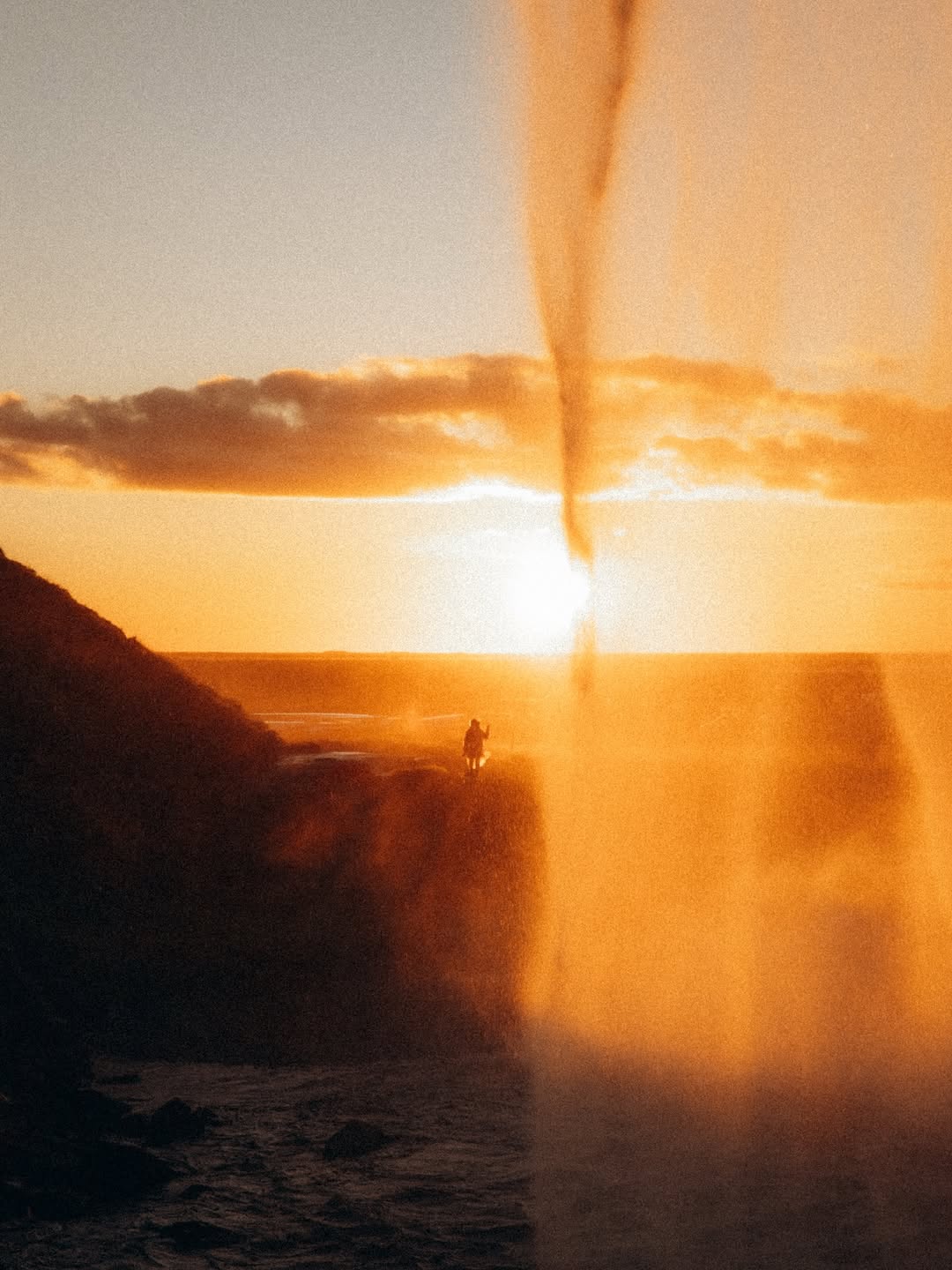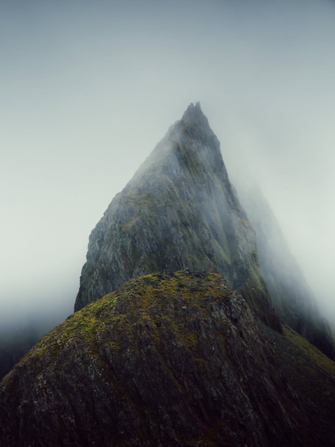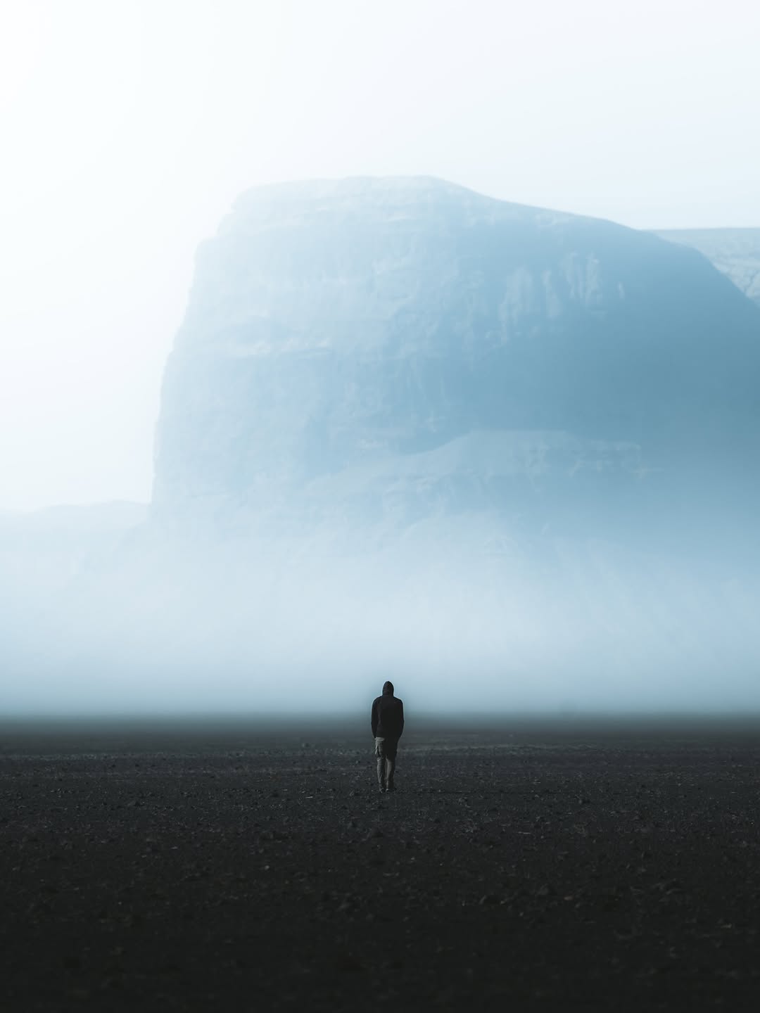 2. 巨大的迷雾山体前,渺小的背影教会我们:在自然面前,学会谦卑也是一种美。