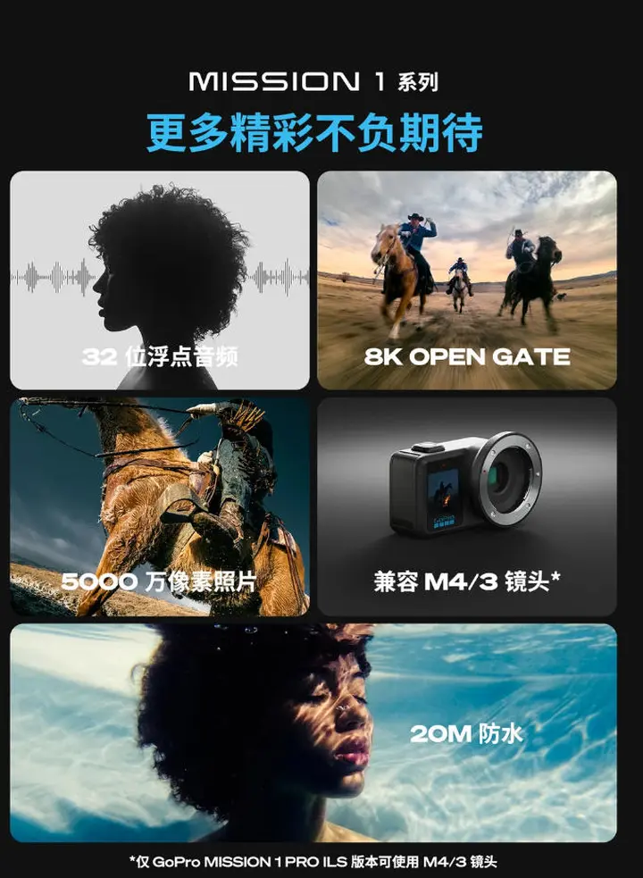 此外,GoPro还推出了Mission 1 Pro ILS,该机型采用M4/3卡口,支持更换镜头。更多细节预计将于发布日前陆续公布。仅从目前已知信息来看,新机将覆盖更丰富的使用场景,运动相机领域恐怕又要再起“硝烟”。