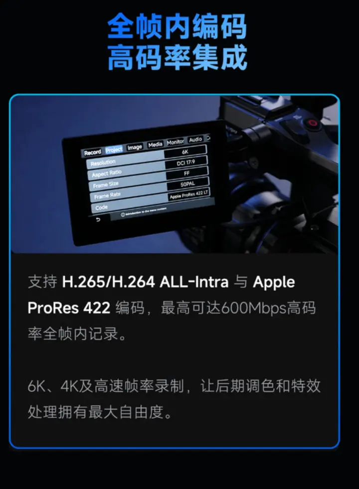 新机支持6K OG@30(29.97)fps、6K 2.39:1 @60 (59.94)fps,、4K Super35@60 (59.94) fps,、1080P @160fps等规格视频录制。
