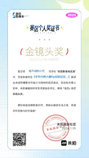 米拍校园影像地区赛,拿到了北方地区【金镜头奖】! 这9张照片,记录了我眼里的长春,和无数个追逐日落的傍晚🌇… 奖品很丰厚,但更开心的是这片景色被大家看到了!✨