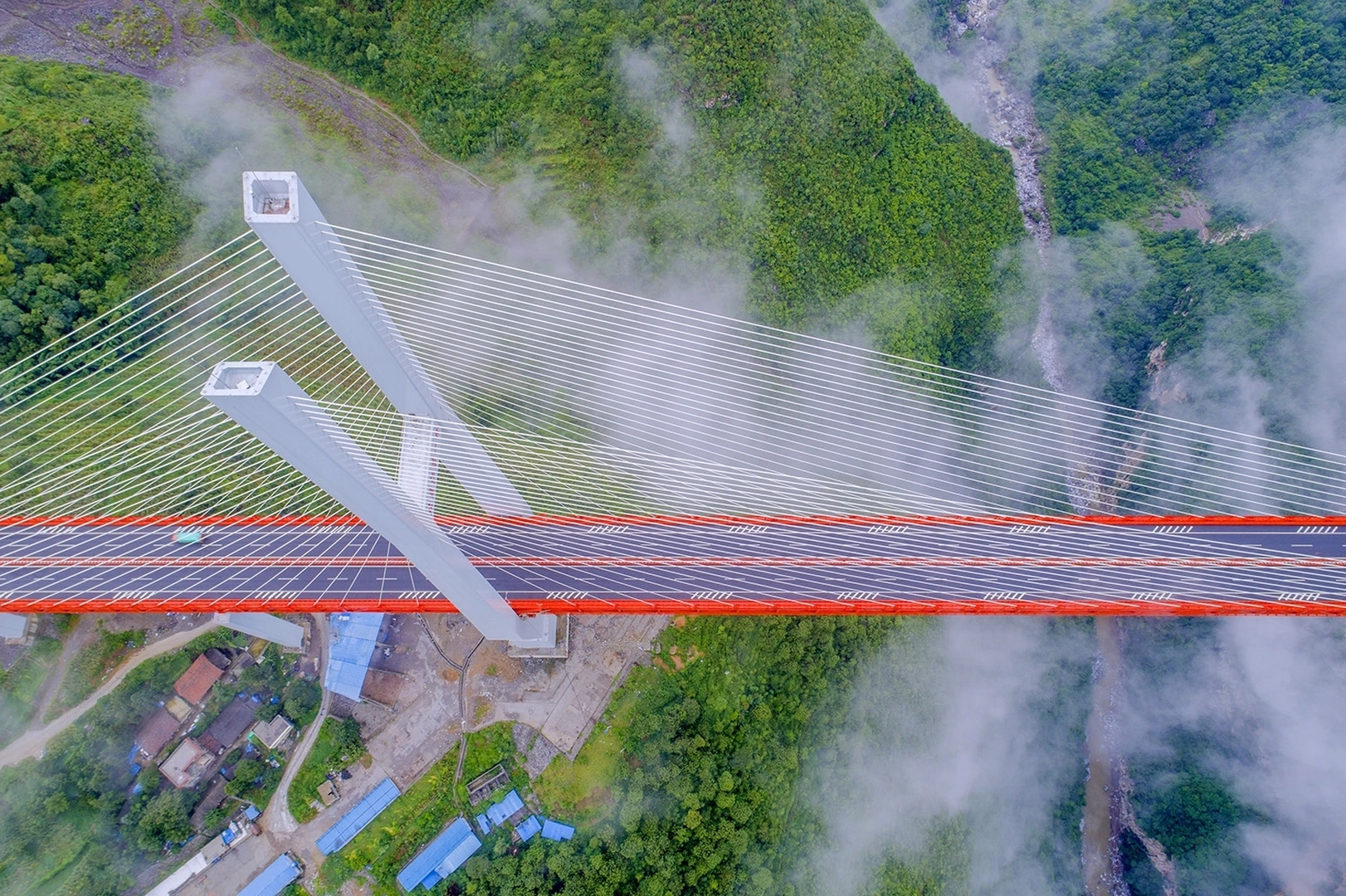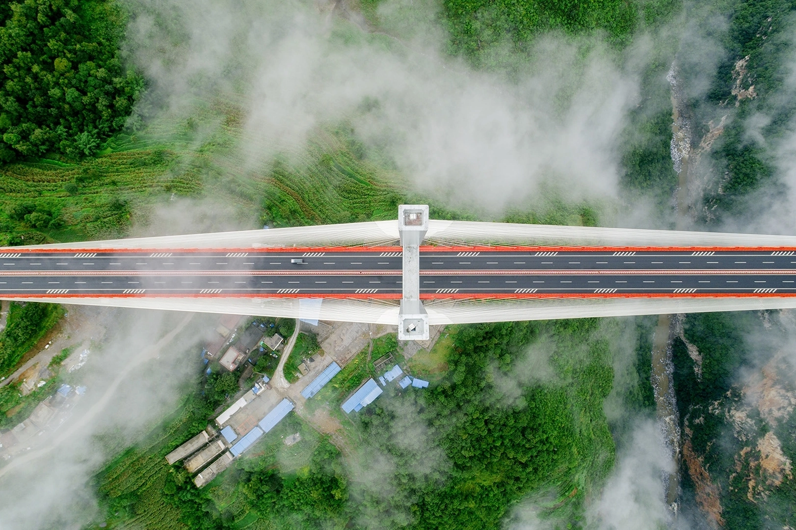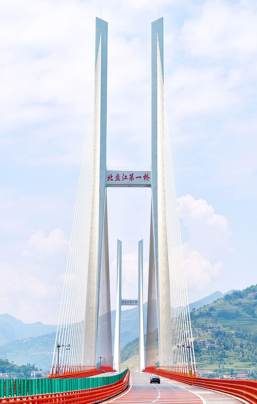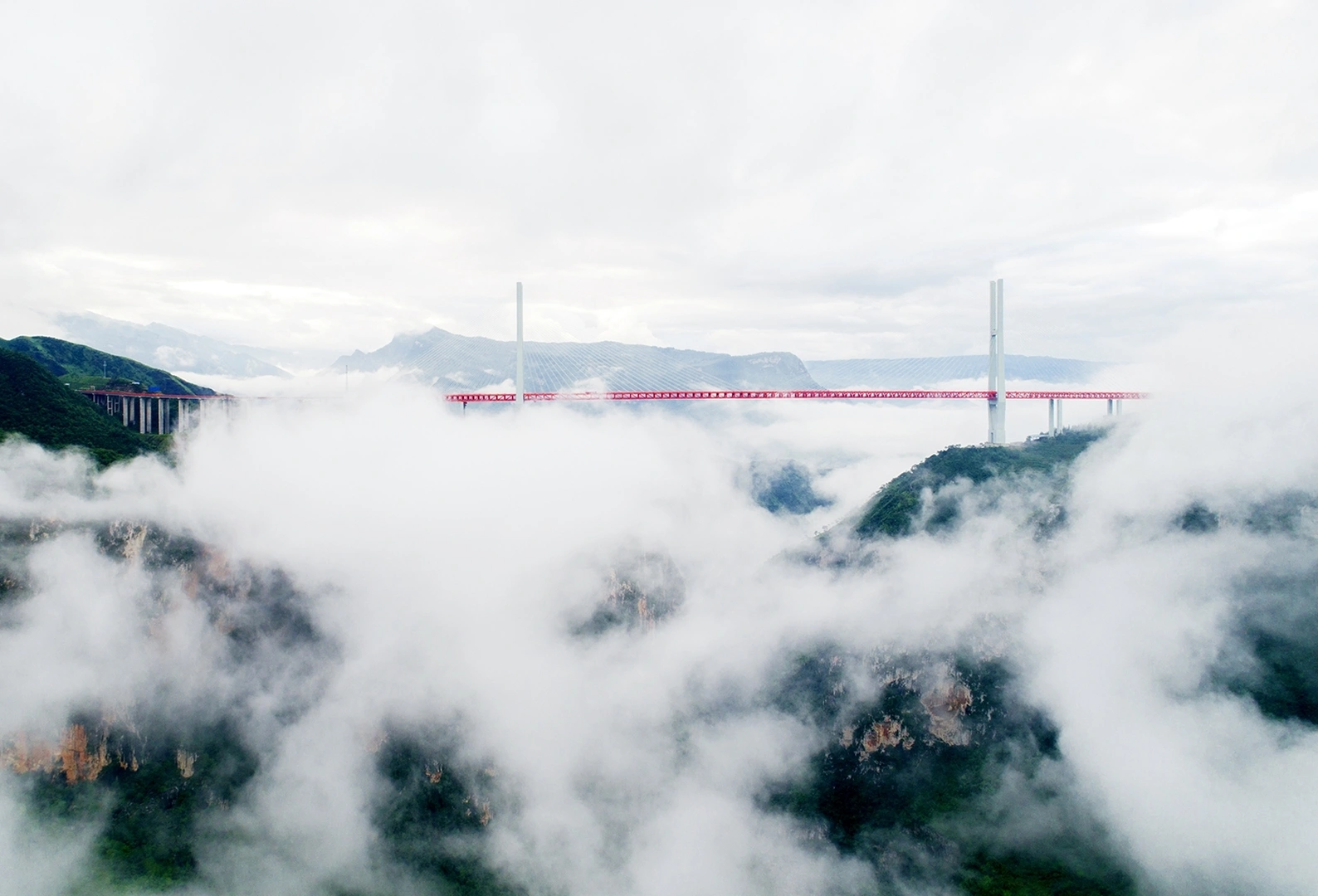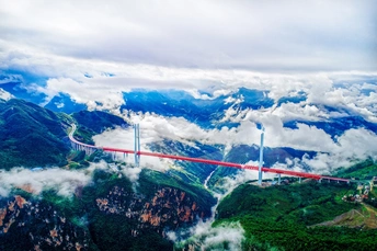 世界第一高桥——北盘江大桥 位于贵州六盘水的北盘江大桥全长1341.4米,总落差1985米,水面离桥面的高度拉出了565米的高差,相当于200层楼高,是世界第一高桥。雄伟的北盘江大桥伫立在沟谷纵横的山峦之间,站在高处眺望,云雾缭绕中的它宛如一条长线划过天际。