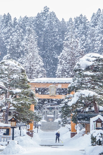 《你的名字》取景地飞弹高山,蓑笠翁在神社下扫雪