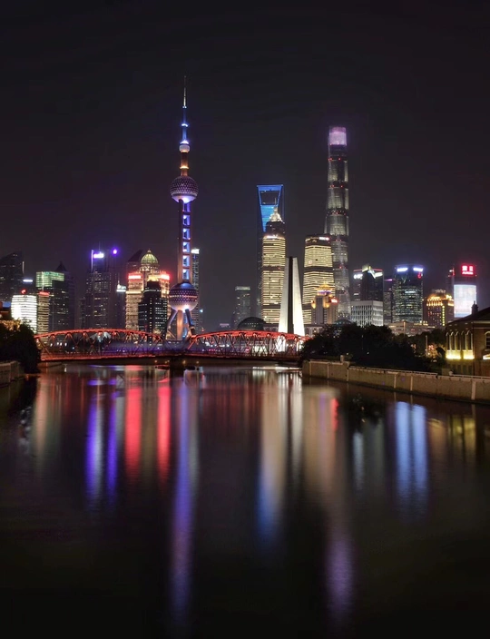 在上海法师桥(乍浦路桥)手机长时间曝光拍摄一张外白渡桥的和东方明珠及三剑客夜景