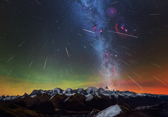 12月14日,一年一度的双子座流星雨如期到来,我们选择在海拔4700米的雅哈垭口守候这一盛象。橙绿相见的气辉弥漫在天际,流星一颗颗从贡嘎雪山山顶坠落,远处的主峰正被月光照亮,顺着主峰往上,则会看到璀璨的冬季银河还有猎户座大星云
