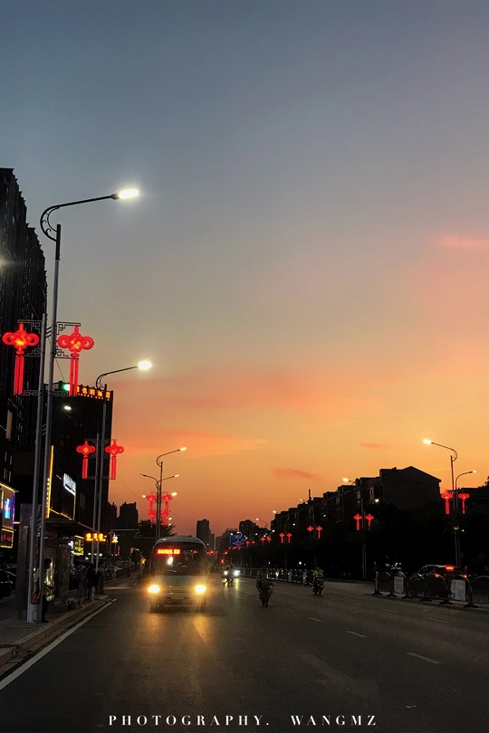 傍晚出门散步 ,看见街灯在晚霞的映衬下格外美丽。