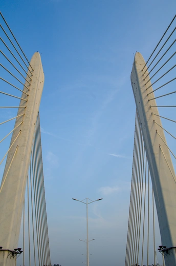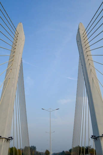 蓝天高远,河谷之上,有桥托起