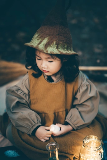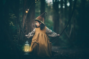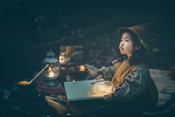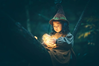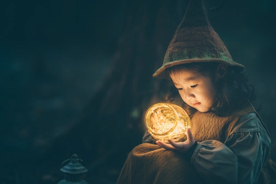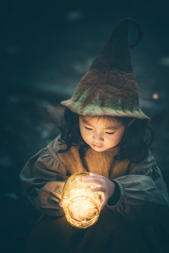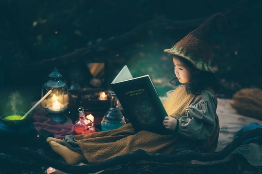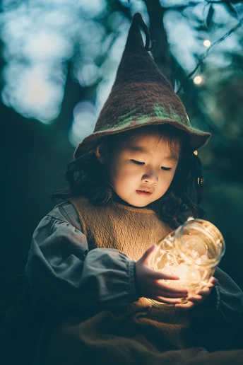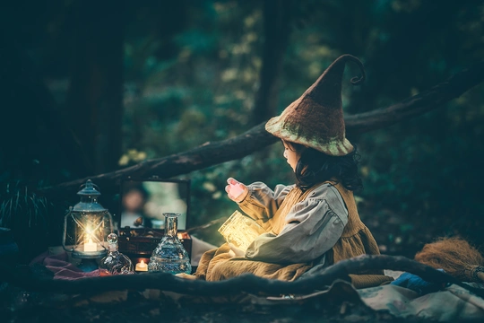 在绿光森林里,住着一个小女巫,她聪明又善良! 但在万圣节之夜, 她的精灵好朋友被阴险的恶魔抓走了。 恶魔以此要挟小女巫在巫魔会上交出魔药的配方。 树梢上, 有精灵朋友留下的魔法瓶, 树藤秋千上, 她歪着小脑袋, 陷入深思中…… 小魔女打开她那神奇的魔法书 她将要研制一种新的魔药 她往汤锅里加7种魔法水 77种动物粉末 还有107种神奇的花草 在魔杖不断的搅拌下 一锅浓绿的粘稠汤药, 在炉火上“呼呼”的冒着气泡。 小女巫取出匣子里特制的橙色魔法水, 喃喃念着魔法咒语 “空特,空得,空蒂,空达,来打败恶魔吧” “小女巫啊,恶魔已经到了巫魔会,你的好朋友等着你呢” 小女巫回头,是萤火虫, 它们在夜空中划出一道道光。 一只蓝色的蝴蝶落在小女巫手上, “小女巫,你准备好了吗?” “是的,我将送给恶魔一个大礼物” 带着熬制好的魔药, 骑着扫把消失在绿光森林。 (故事纯属瞎编乱造,如有雷同,请忽略)