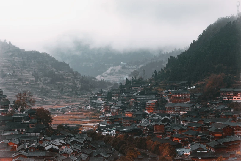 中国贵州西江千户苗寨阴雨天拍摄