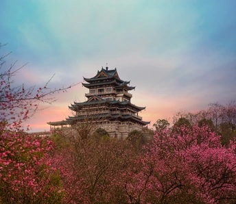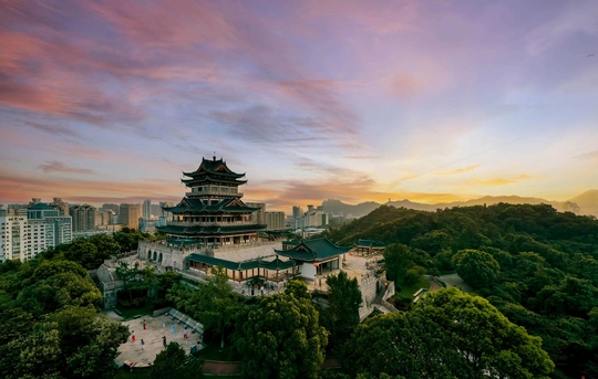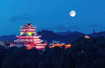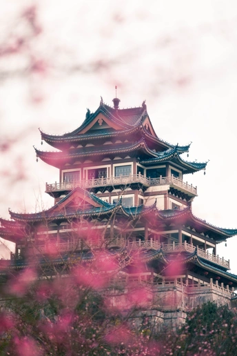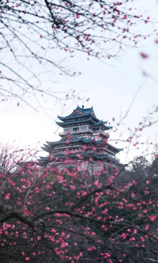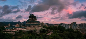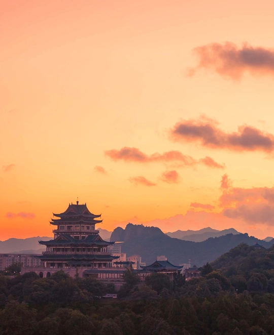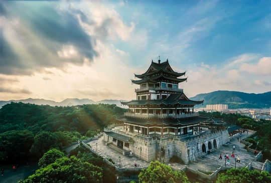 温岭地标建筑——东辉阁。坐落于市区瓦屿山公园,阁高35米,为明三暗五歇十字脊顶仿明清古建筑造型,正门南面有山门牌楼,东西有扇亭和游廊等附属建筑。