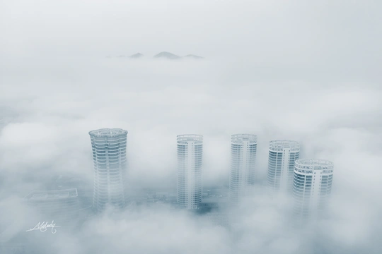 大雾之中,高耸入云的建筑与远处的山脉遥相呼应