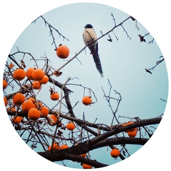 喜鹊在枝头啾啾,柿红满枝沉甸甸
