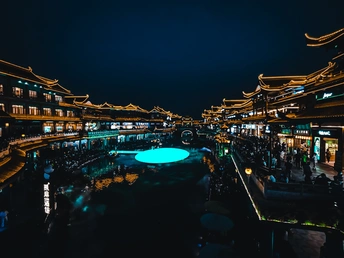 地址位于眉山市东坡区商业水街,这座城市曾是苏东坡故居,苏仙北宋眉州眉山(今属四川省眉山市)人 夜幕下的水街 灯火辉煌 宛如城市里的天上宫阙