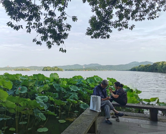 在西湖休息区, 一对夫妻中途停下来休息, 各自玩着手机, 如果他们是在聊着天该有多好呀~