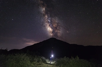 8月第一天,在泥巴山垭口拍摄的银河星空下,朋友举起灯