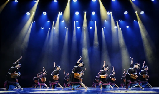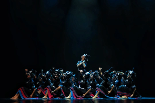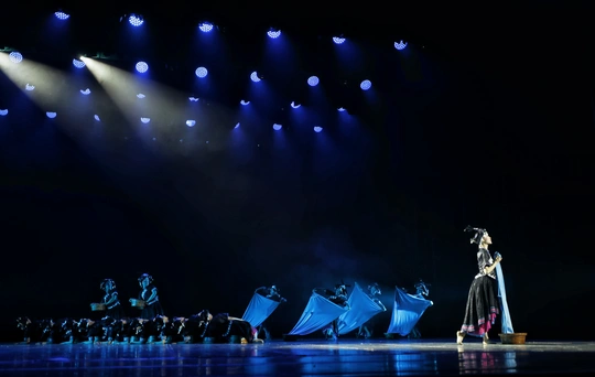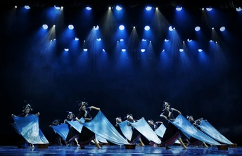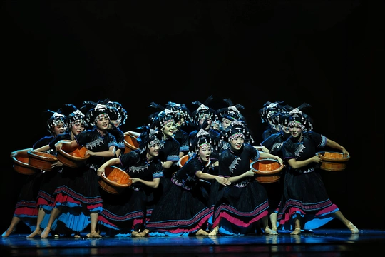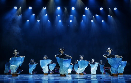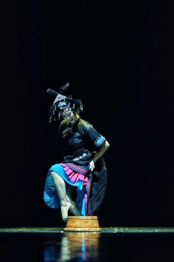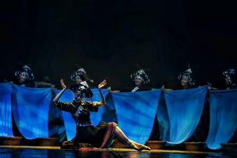 一群壮家姑娘婀娜多姿地时而穿梭在淙淙流水间,时而欢快地浣着衣纱,不经意的流年中是姑娘们年轻的身姿;蓝色的纱幔营造了一个浪漫的时空,诗般的意境。