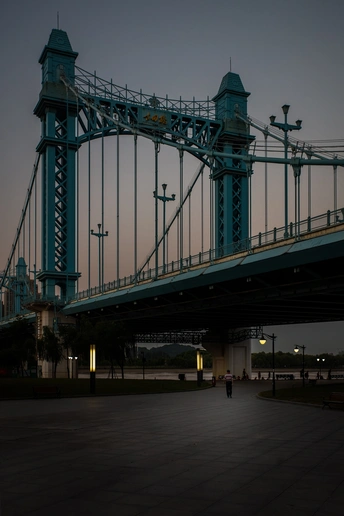 清晨的古田桥下,少了人群的喧嚣,正在散步的老人孤单背影,衬托了清晨的宁静。