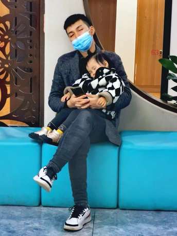 清晨,体检中心的长凳上,父亲与怀中的女儿在等待体检中的妈妈时双双睡着