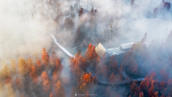 晨雾散去一些后,池杉湖中的小屋露了出来