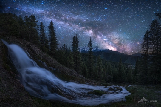 在这个极其危险的瀑布旁,用提前准备的保险绳,将人和旁边的树连接起来才敢拍摄,否则很容易摔下这个极陡峭的山坡,地面使用双排矩阵接片完成拍摄。