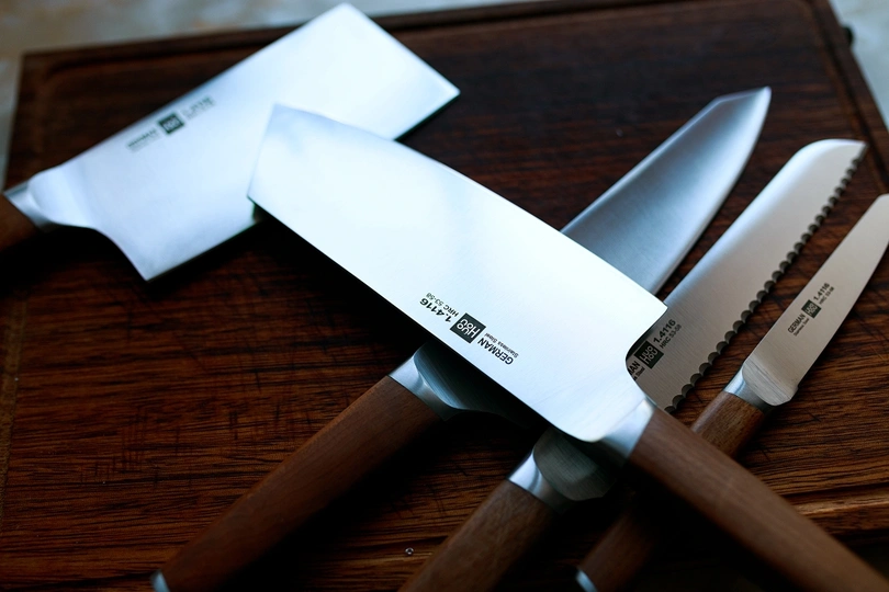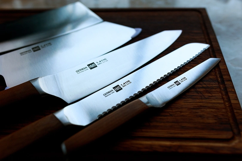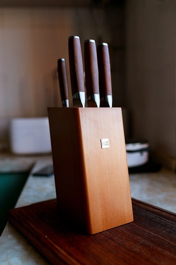 这套火候德国钼钒钢厨刀就是标准的德系刀,套装内包含五把厨刀和一个榉木刀架。五把刀分别是:砍骨刀、切片刀、厨师刀、面包刀、水果刀,各项功能完善,做工品质优良。榉木刀架做工也是十分优秀,让厨房收纳变得美观且简单。 这套刀均采用欧洲标准的1.4116钼钒钢,富含铬、钼、钒三种稀有金属,优点韧性好,硬度高,耐腐蚀性强,不易脆断和变形,是很多德系高端厨刀的主流钢材,耐用性很好。 火候在保留经典德系厨刀优点的同时,经过重新设计和改良,打造出这套更加贴合国人使用习惯的厨刀,优良的配重分配,握持感极佳。同时采用水磨开刃,刀口锋利耐用,拥有更顺畅的切割体验。 对于我来说,使用频率最高的就是砍骨刀和切片刀了,砍骨刀净重392g,入手分量极佳,挥砍有力,刀身很厚,刀刃打磨也比较厚重,砍剁骨头无需担心崩刃,一砍即断,干净利落。 切片刀净重302g,在保证用料的同时,尽量轻盈,长久使用不手酸。与市面上其他品牌的切片刀不同的是,这款刀身采用加宽的设计,更贴合国人处理食材的习惯。切片、切丝、切丁更加轻松,久切不累手。 加长的实木碳化手柄,更易握持,实木经过碳化处理,结构更加稳定,不开裂不变形,耐腐蚀性更佳。