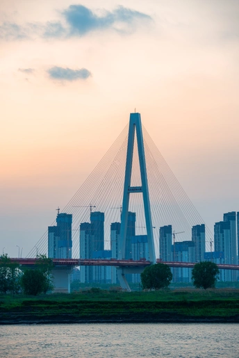 本次拍摄在日落时分进行,天空的橙黄色和桥梁的冷色调形成了对比色,让桥梁主体更加凸显,同时本次拍摄用了减光镜进行了慢门拍摄,让水面更加平静,天空更加的纯净。 武汉白沙洲长江大桥于1997年5月开工,2000年9月9日正式通车,工程总投资11亿元全长3589米,桥面宽26.5米,6车道,设计时速为80公里,日通车能力为 5 万辆,最大跨度618米,为世界第三大桥。