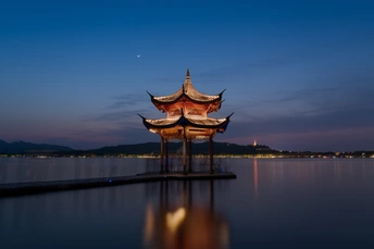 集贤亭算是杭州西湖比较知名的景点,游人如织。想要拍出完美的亭子必须包含晚霞和灯光,游客也不能太多。这张照片没有绚丽的晚霞,但是多了一轮弯弯的月牙,也是别有风味。游客驻足停留,欣赏此时的美景。