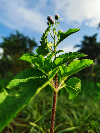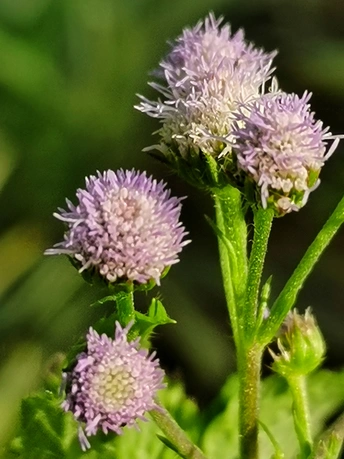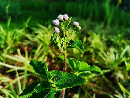 藿香蓟(学名:Ageratum conyzoides L.):一年生草本,高50-100厘米,有时又不足10厘米。无明显主根。茎粗壮,基部径4毫米,不分枝或自基部或自中部以上分枝。全部茎枝淡红色,或上部绿色,被白色尘状短柔毛或上部被稠密开展的长绒毛。叶对生,有时上部互生,卵形或长圆形,有时植株全部叶小形,基出三脉或不明显五出脉。头状花序4-18个在茎顶排成通常紧密的伞房状花序,总苞钟状或半球形,宽5毫米。总苞片2层,长圆形或披针状长圆形。花冠长1.5-2.5毫米,外面无毛或顶端有尘状微柔毛,檐部5裂,淡紫色。瘦果黑褐色,5棱。花果期全年。 生山谷、山坡林下或林缘、河边或山坡草地、田边或荒地上。由低海拔到2800米的地区都有分布。原产中南美洲。作为杂草已广泛分布于非洲全境、印度、印度尼西亚、老挝、柬埔寨、越南和中国等地,有栽培,也有归化野生分布的。