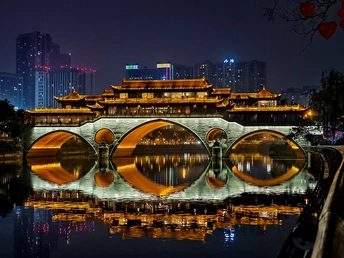 安顺廊桥位于四川省成都市府河与南河交汇处的合江亭旁,横跨南河,安顺桥有着悠久的历史,最初的建筑踪迹可以追溯到元代。在马可·波罗的游记中,安顺廊桥是他印象中较为深刻的四座大桥之一。二十一世纪初,安顺桥几经修建才得以恢复其大致的原貌。直到2000年成都府南河工程指挥部重新设计建造,经过三年地精心雕琢,崭新的安顺廊桥于2003年8月3日亮相。 这座桥全长81米宽6米,有着明清风格。桥面通道及栏杆均由青石制成,桥栏杆上雕有梅、兰、竹、菊等代表中国传统民间文化的图案,桥墩上配有两个水兽镇桥。桥的两侧各有一座仿古牌坊,桥面和牌坊红墙青瓦,飞檐翘角,曲栏回廊,高度浓缩了中华民族建筑风格之精华。 现在的安顺廊桥已不仅仅是方便人们过河的“天堑”,聪明的成都人在廊桥内搭建了高档的餐厅和休闲娱乐场所,在给来往的中外游人带来古色古香的文化内涵的同时,更赋予了它新的作用和意义,是一座集历史、文化、商贸、餐饮、行人功能为一体的景观桥。 中文名 安顺廊桥 外文名 Anshun bridge 别名 虹桥、安顺桥 长度 81 m 宽度 6 m