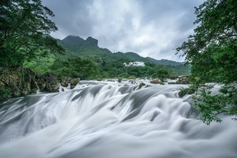 贵州名瀑布众多,除了黄果树大瀑布同一景区内还有一个银链坠潭瀑布同样壮观!这里不像大瀑布一样有着巨大的落差,数个阶梯状的小瀑布于最低处汇聚到一起形成一个巨大的漏斗状瀑布。照片拍摄点位刚好正对着交汇处,距离不过十来米,现场震耳欲聋,蔚为壮观