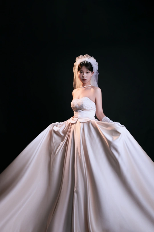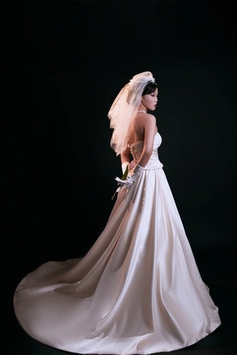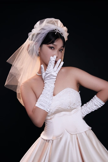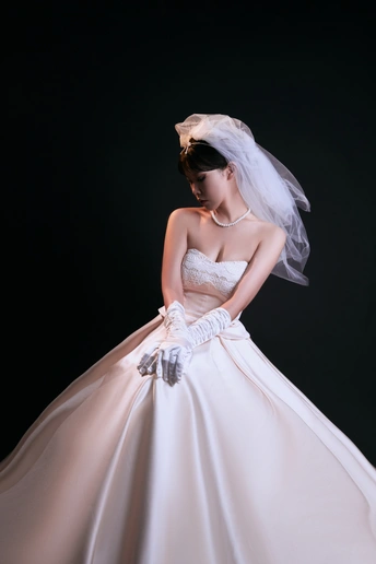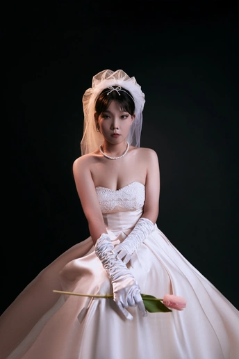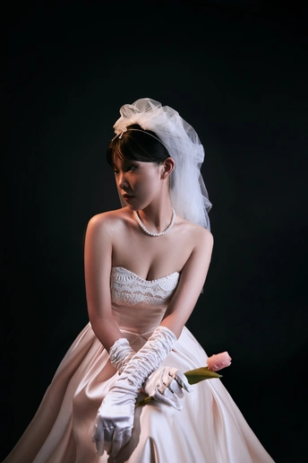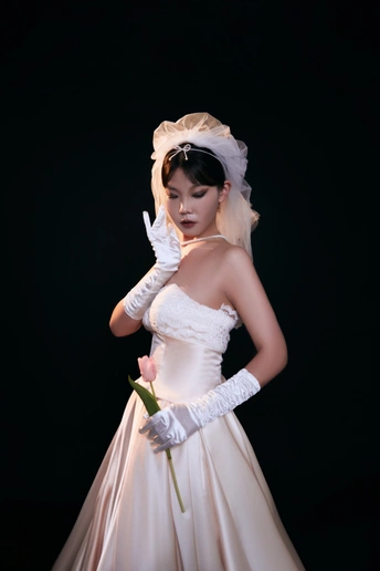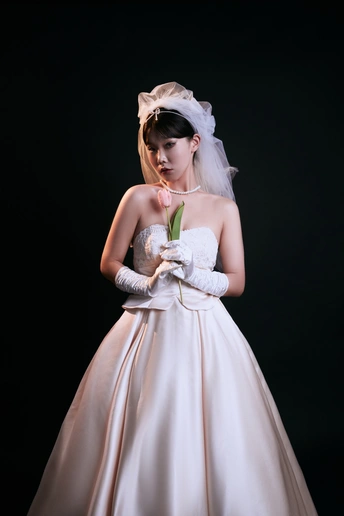 高级浪漫的法式礼服写真|室内高定系列 缎面的香槟色法式礼服相比于白纱 更能呈现少女的高级感,时尚氛围感温婉大方,高级而有脱俗 透露着纯粹干净的气息 给人一种杂志大片的质感 珍珠的头饰,搭配精致的气息妆容彰显了女人的魅力 如同女神版降临人间