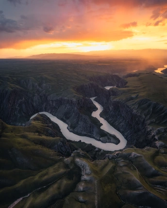 摄于新疆伊犁喀拉峻鳄鱼湾,采用五组包围曝光接片。 阔克苏大峡谷发源于天山山脉中部,由亿万年来沉积的岩层随地质运动和天山雪融水交相作用而形成,位于新疆伊犁八卦城特克斯县南部。站在山上鸟瞰峡谷,整个峡谷美景尽收眼底。 阔克苏大峡谷之中美丽的阔克苏河蜿蜒曲折,崖岸陡峭,地势险峻,形成了壶口瀑布、九曲十八弯、鳄鱼湾等自然景观。这里群山环绕,山峦重叠,谷间河水平缓,波光荡漾,河湾植被郁郁葱葱,炊烟和着林间轻雾,牧民的毡房若隐若现点缀其间,一派壮美而又不失旖旎的峡谷草甸风光。