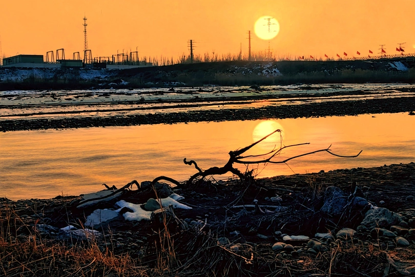 冬季的提孜那甫河,失去了往日的汹涌和澎湃,日落的夕阳反射在绵细的河面,孤独的胡杨残根、仿佛在向人们诉说那古老的提孜那甫河传说……!