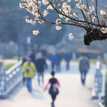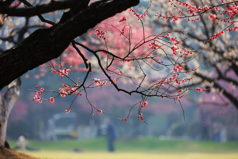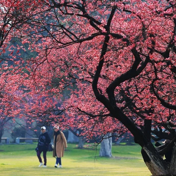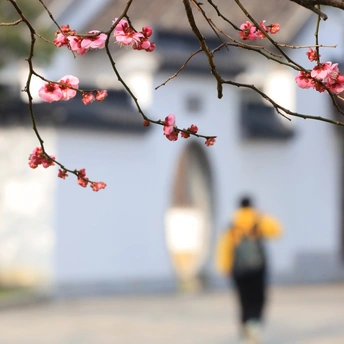 早春的梅花樱花次第绽放,玄武湖古建也萌发了生机,古建花植相映成辉,春意盎然。