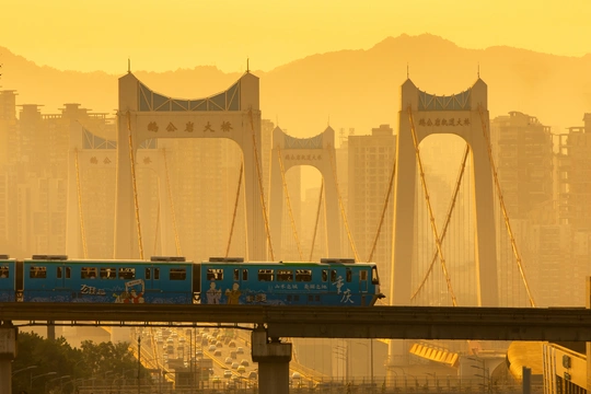 清晨第一缕阳光洒下,一列轻轨从鹅公岩大桥前快速驶过