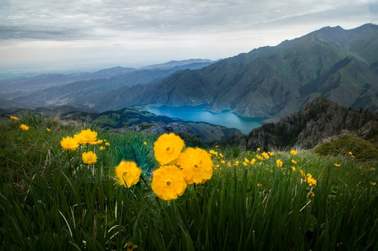 这张照片拍摄于海拔3056米的马牙山顶,当时天气阴雨,山上气温低,湿度高,风力强盛,气温仅为1.5℃。我穿着雨衣,没有任何保暖措施,徒步翻越两座山来到马牙山顶,在行进过程中发现路旁的一簇金莲花与天山天池交相辉映。金莲花为天山海拔3000米以上特有的一种植被,且具有冰清玉洁的特征,以金莲花衬天池水,别有一般滋味