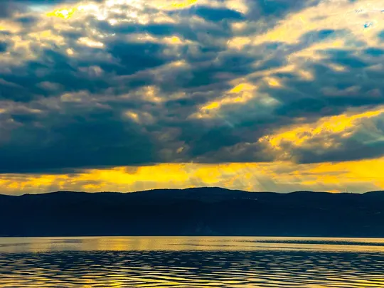 静静的洱海,随着太阳的升起,瞬时间天空霞光万道,彩云飞舞,洱海水面也泛起阵阵涟漪,映衬着天空色彩斑斓的变化而波光粼粼,金光闪闪。