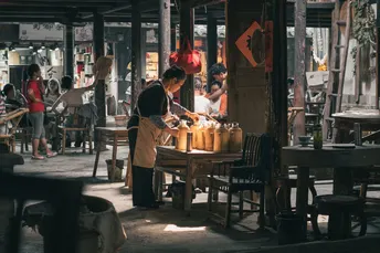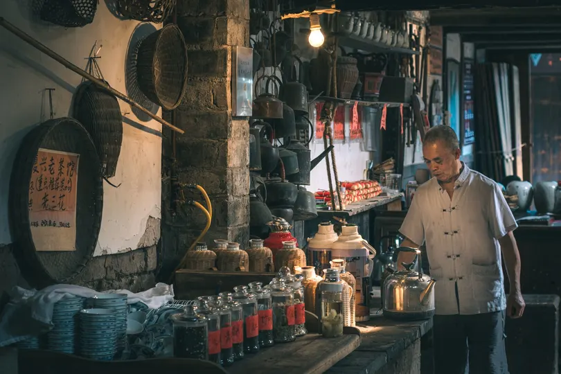 “热闹属于大家,而我属于这小小茶馆,名为空城。” 作品简介:本次作品记录的是一间川调老茶馆的见闻,跨入门槛第一步听到的就是原汁原味的调调“贵客临门,里边儿请!”烧水、放茶叶、冲泡,所有动作一气呵成,他们的服务并没有伴随着“客官慢用”而结束。馆内仅有的两个火坑轮流烧开热水,两位老人轮流更换木质保温壶,在来来往往的客人中显得那么不可缺少又格格不入。热闹是属于茶客的,而两位老人仅仅是这间茶铺的守候者,或者说是这间茶铺守候这老人。在这小小的空城。 拍摄思路:习惯性的捕捉两位老人在茶铺工作时的照片,利用好房顶撒下的阳光,与昏暗的茶铺内部形成冷暖对比冲突。无论是阳光照耀在老人身上或是茶具中,总有暗青色冷掉与之对比呼应,冷清和热闹一定是同时具备的!突出自己在拍摄时心中所塑造的主题——热闹也是一种冷清的孤独,最怕热闹与自己无关;冷清也是一种陪伴,正如这间老茶铺,晃眼便是半百的坚守相伴 地标详细位置:黄龙溪古镇