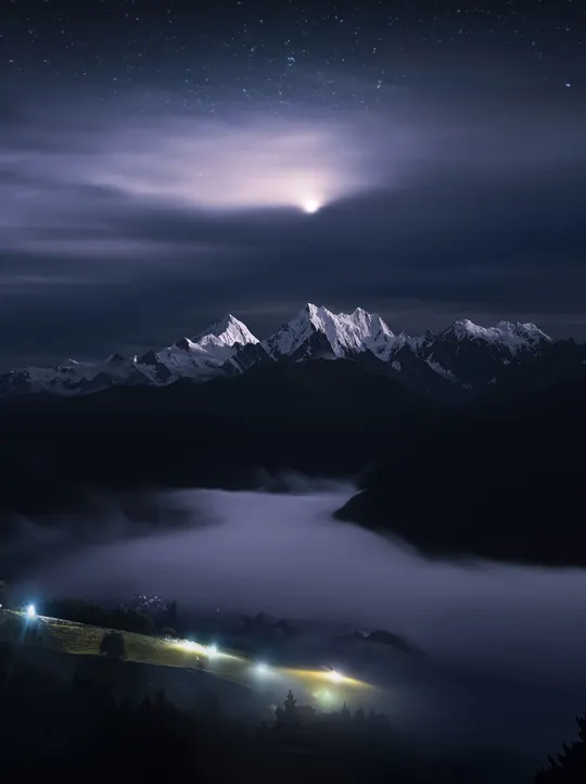 雪达村星空下瞭望雪山,月光是一个照亮地表且独有的灯柱 此片进行了时间合成和焦段合成!