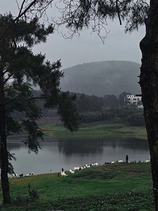 蒙蒙细雨中,路过薄山湖,记录下了一位爷爷在雨中放羊#驻马店